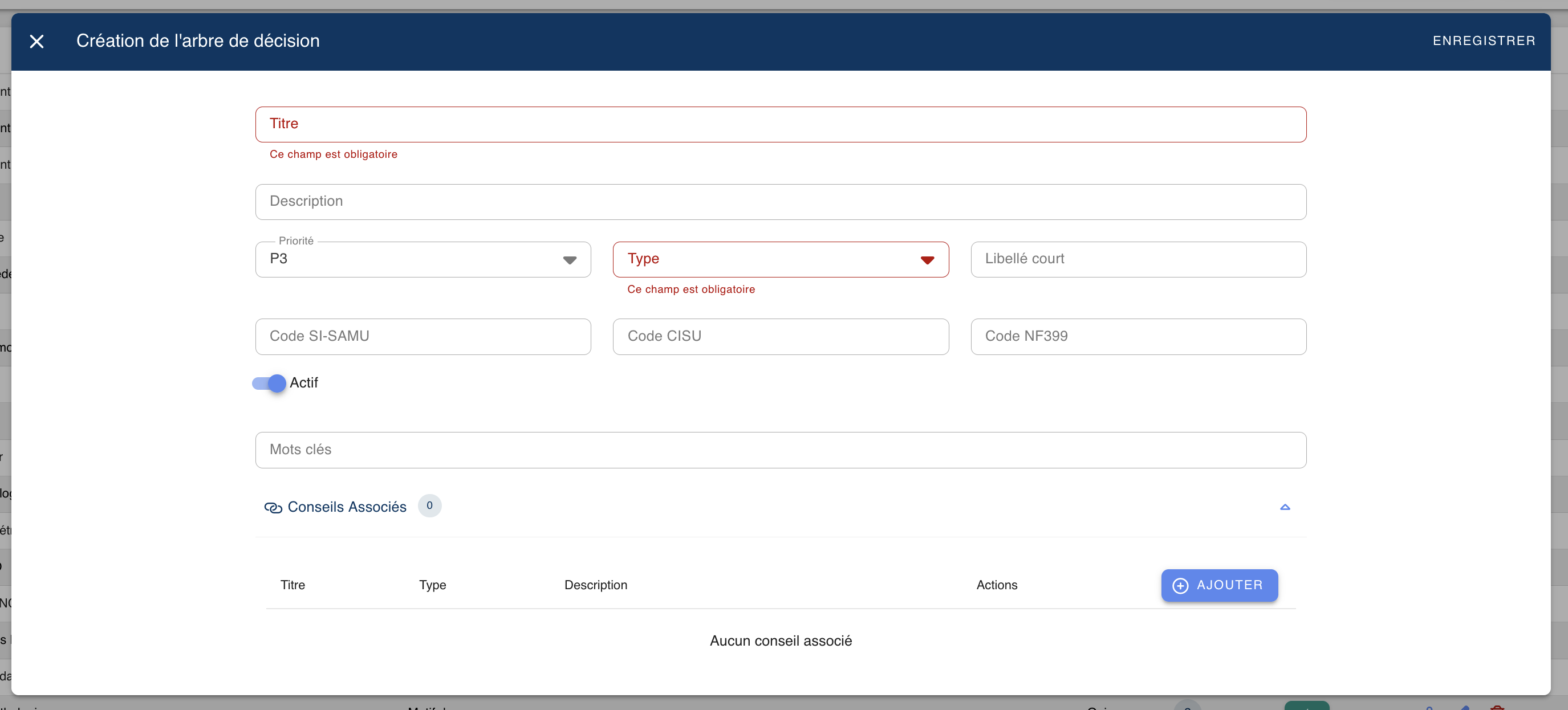 Ajout d'un arbre de décisions ou d'un sous élément : cliquez sur le bouton "ajouter" dans le coin supérieur droit de l'écran. L'écran d'ajout permet de saisir les informations nécessaires :