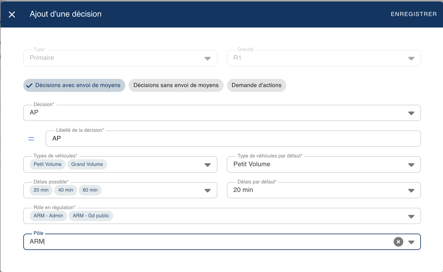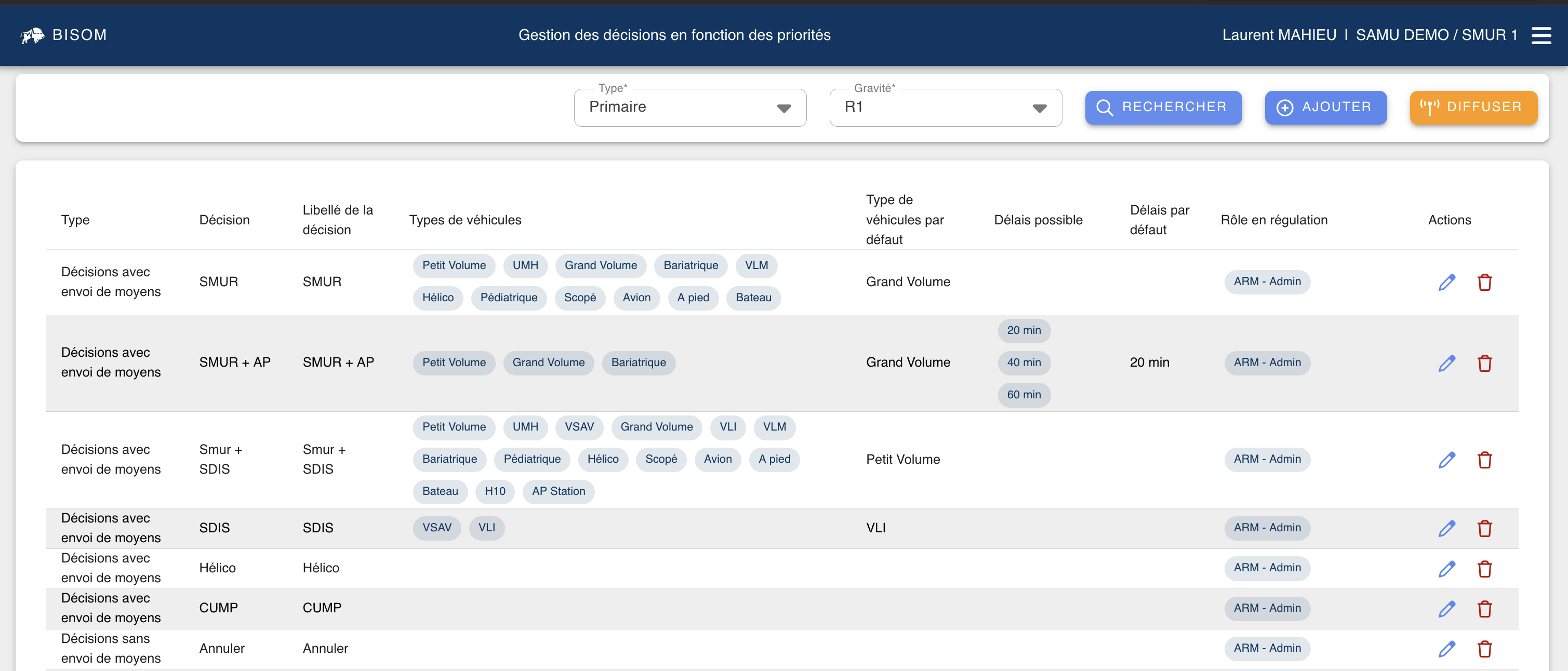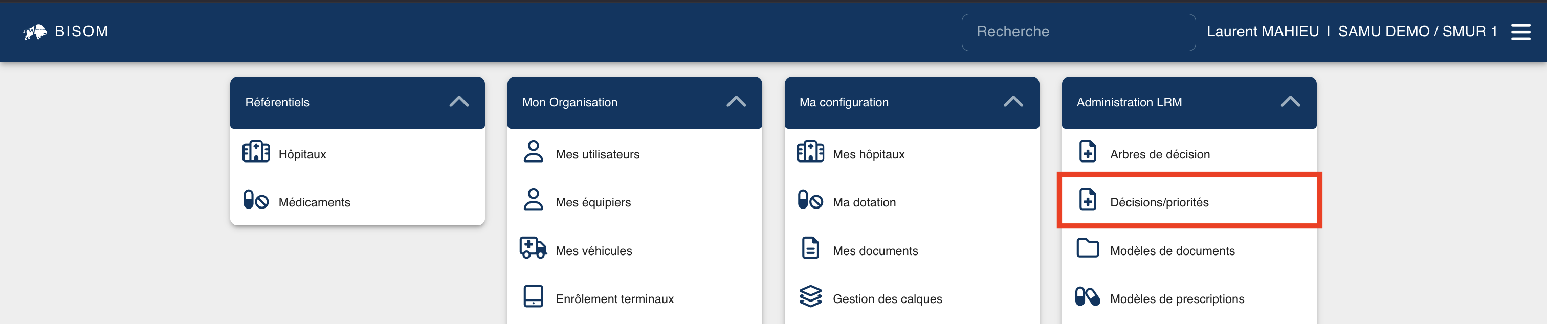 Les administrateurs et représentant légaux des entités clientes de BISOM ont la possibilité de gérer les décisions disponible en fonction de la priorité du DRM ( priorité ou gravité selon la configuration du SAMU ).