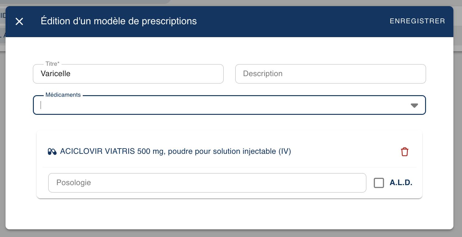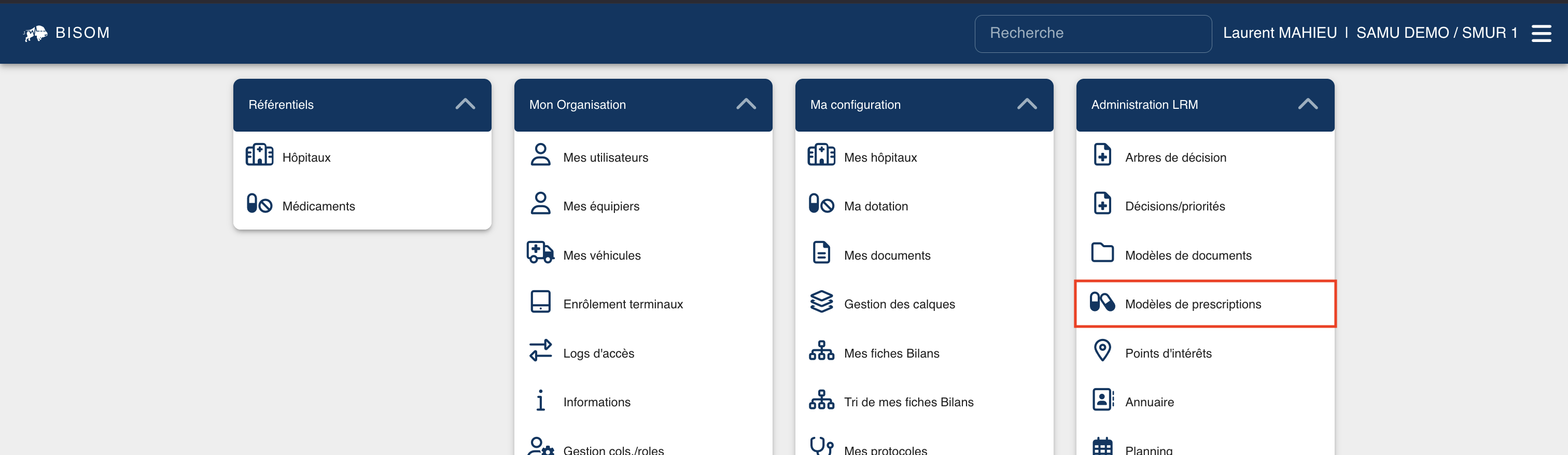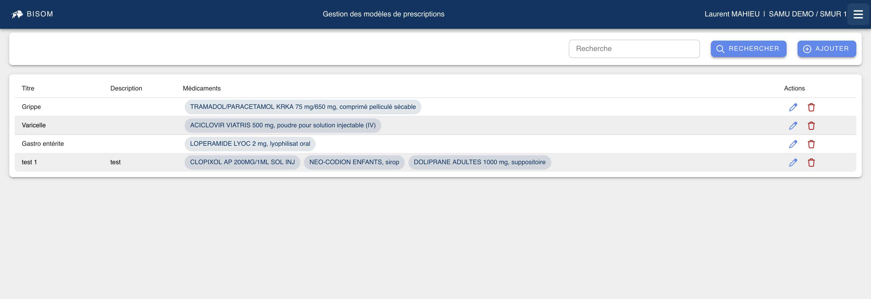 Les administrateurs et représentant légaux des entités clientes de BISOM ont la possibilité de gérer la liste des modèles de prescriptions.