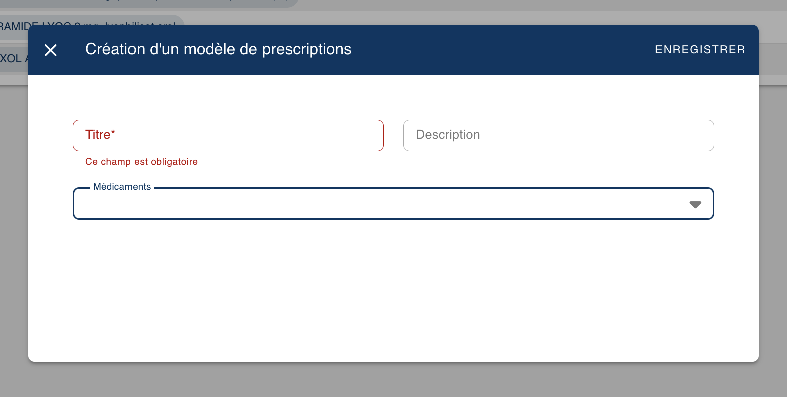 Ajout d'un modèle de prescription : cliquez sur le bouton "ajouter" dans le coin supérieur droit de l'écran.