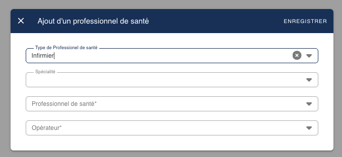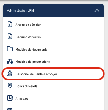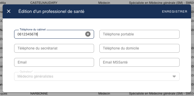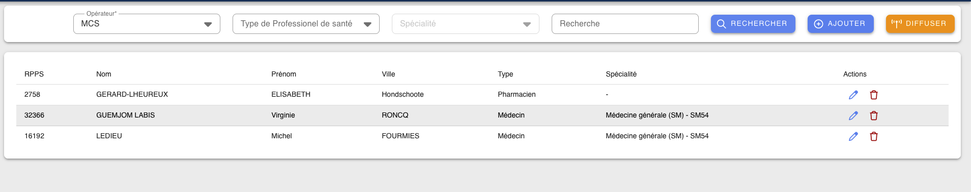 Cet écran permet de consulter la liste des médecins actuellement déclarés comme disponibles pour la régulation, de les filtrer selon plusieurs critères (type d'exercice, profession de santé, spécialité, recherche libre) et d'effectuer des actions de gestion (ajout, mise à jour des informations, suppression). Il s'appuie sur les référentiels de professionnels de santé et de compétences médicales, et affiche les informations clés nécessaires à la prise de décision en régulation (RPPS, nom, prénom, ville, type, spécialité).